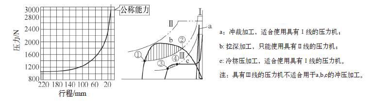 圖為行程壓力曲線,顯示壓力機的行程長度和公稱能力發生位置、滑塊的下死點上位置和壓力機能夠產生的加壓力之間的相互關系。從曲線圖上可以看出最大加壓力就是公稱能力,公稱能力發生的位置就是公稱能力發生點。從公稱力發生點到下死點之間可以達到公稱能力,從能力發生點開始越向上,離下死點的距離越大能夠發生的加壓力越小。